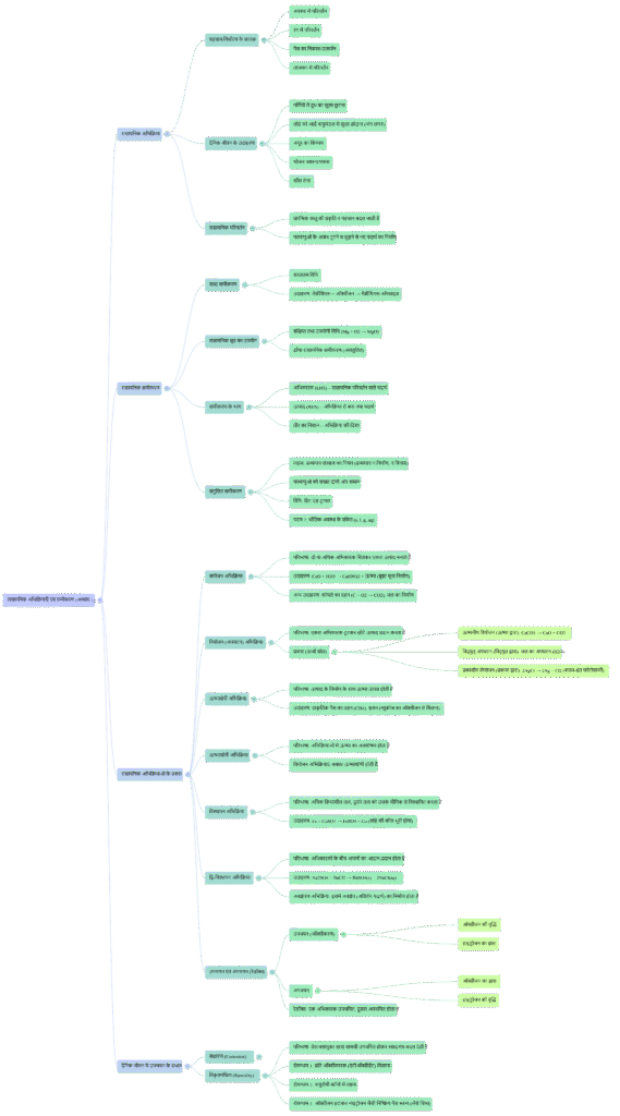| रासायनिक समीकरण (Chemical Equation) | किसी रासायनिक अभिक्रिया को दर्शाने के लिए रासायनिक सूत्रों और प्रतीकों का उपयोग। |