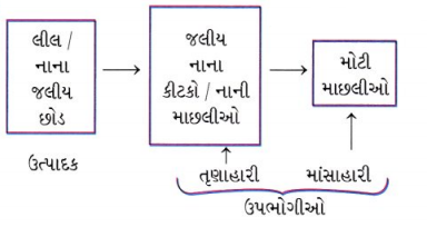 જળચર સજીવોનાં નામ તે ક્રમમાં લખો, જેમાં એક સજીવ બીજા સજીવને ખાય છે અને એક એવી શૃંખલાની સ્થાપના કરો, જેમાં ઓછામાં ઓછા ત્રણ તબક્કા હોય.