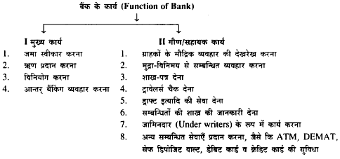 (3) इसके अलावा जामीनदारी (Under writers) की सेवा, पूँजी-विनियोग सम्बन्धी मार्गदर्शन, विदेशी पूँजी में परिवर्तन इत्यादि कार्य करते हैं । सार्वजनिक जनता के कार्य में बैंक का महत्त्व : बैंक आम जनता की बचत को जमा के रूप में स्वीकार करता है । जमा कर्ता को ब्याज की अदायगी करके आम जनता को बचत की योग्य दिशा की ओर मोड़ते हैं । इसके अलावा देश के कई ट्रस्ट, निवृत्त व्यक्ति को ग्रेच्युटी, पेन्शन इत्यादि उनके बैंक में विनियोग द्वारा ब्याज की आय प्राप्त करते हैं व जीवन-निर्वाह करते है एवं उनकी बचत सुरक्षित होने से चिन्ता या जोखिम में से उन्हें मुक्ति मिलती है । इसके उपरान्त कम खर्च में द्रव्य का हस्तांतरण एवं असंख्य लोगों को बैंक द्वारा रोजगार प्राप्त होता है ।