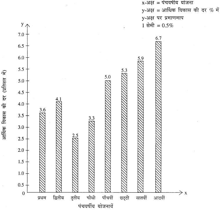 उपरोक्त आलेख में x अक्ष पर पंचवर्षीय योजनायें और y अक्ष पर भारत में आर्थिक विकास की दर प्रतिशत में दर्शायी गई है ।