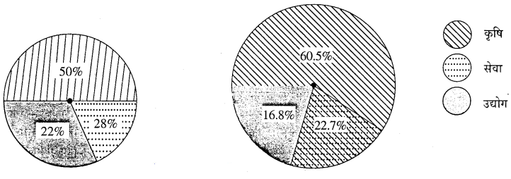 1. तुलनात्मक अध्ययन के लिए भारत और चीन में रोजगारी से सम्बन्धित सांख्यकीय जानकारी वृत्तांश आकृति द्वारा प्रस्तुत की गयी है ।