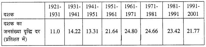 4. 1961 से 1981 के 20 वर्षों में यह दर लगभग 25% जितना रहा है । इसलिए इस समय में जनसंख्या तेजी से बढ़ी है अर्थात् इसी समय को भारत में जनसंख्या विस्फोट का समय माना गया है ।