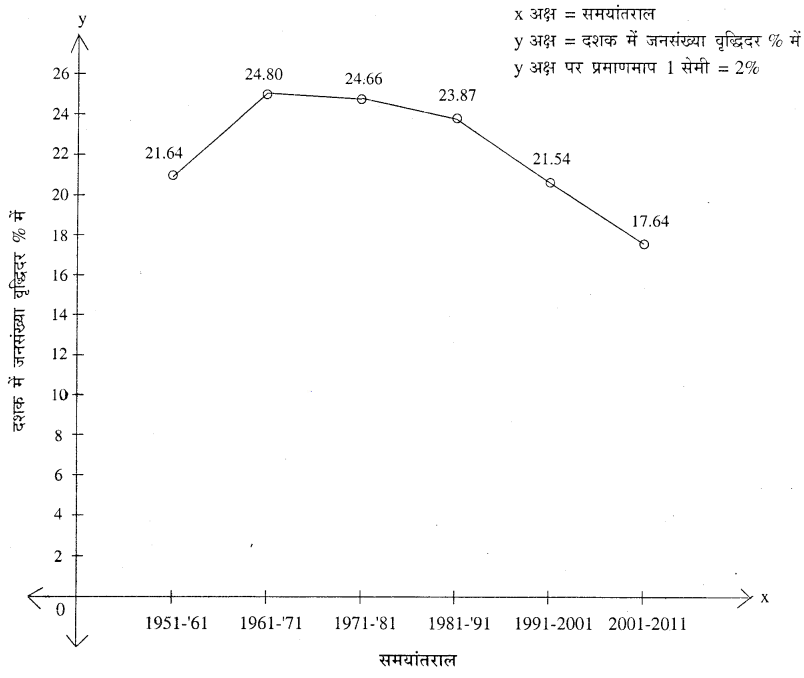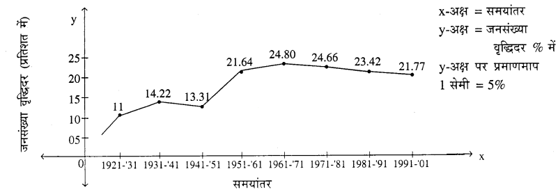 1. आलेख x अक्ष पर दस-दस वर्ष के समयांतर को तथा y अक्ष पर जनसंख्या वृद्धि दर प्रतिशत में दर्शाई गयी है ।