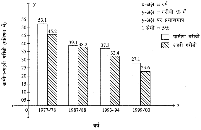 1. आलेख में x अक्ष पर वर्ष तथा y अक्ष पर ग्रामीण एवं शहरी गरीबी को प्रतिशत में दर्शाया गया है ।