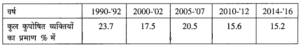 - वर्ष 2014-’16 में कुपोषण का प्रमाण 15.2 प्रतिशत है जो 2010-’12 की तुलना में मामूली गिरावट है ।